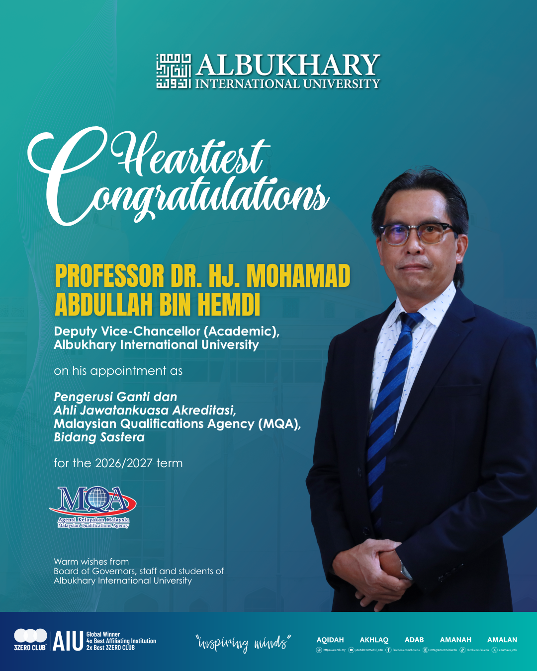 Albukhary International University (AIU) extends its warmest congratulations to Prof. Dr. Hj. Mohamad Abdullah Bin Hemdi, Deputy Vice-Chancellor (Academic), on his appointment as Alternate Chair and Accreditation Committee Member (Arts) at the Malaysian Qualifications Agency (MQA) for the 2026/2027 term.