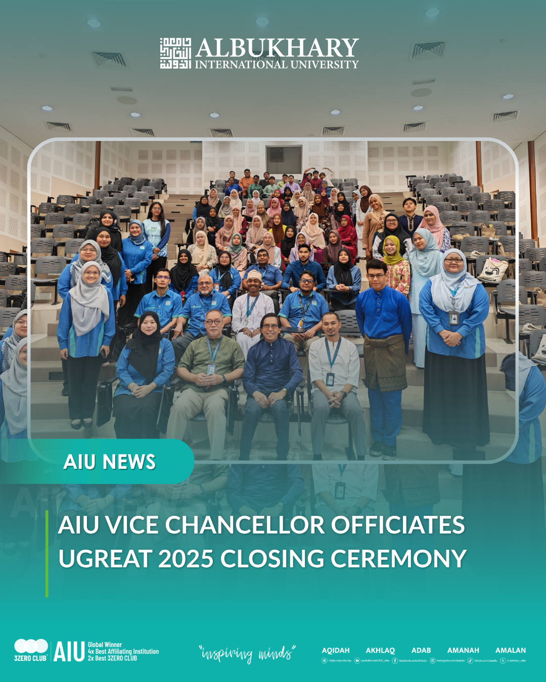 ALOR SETAR, 10 October 2025 – Albukhary International University (AIU) held the closing ceremony of the UGREAT 2025 Programme, officiated by Prof. Dato’ Ir. Dr. Mohd Saleh bin Jaafar, Vice Chancellor and President of AIU, this morning at the Lecture …