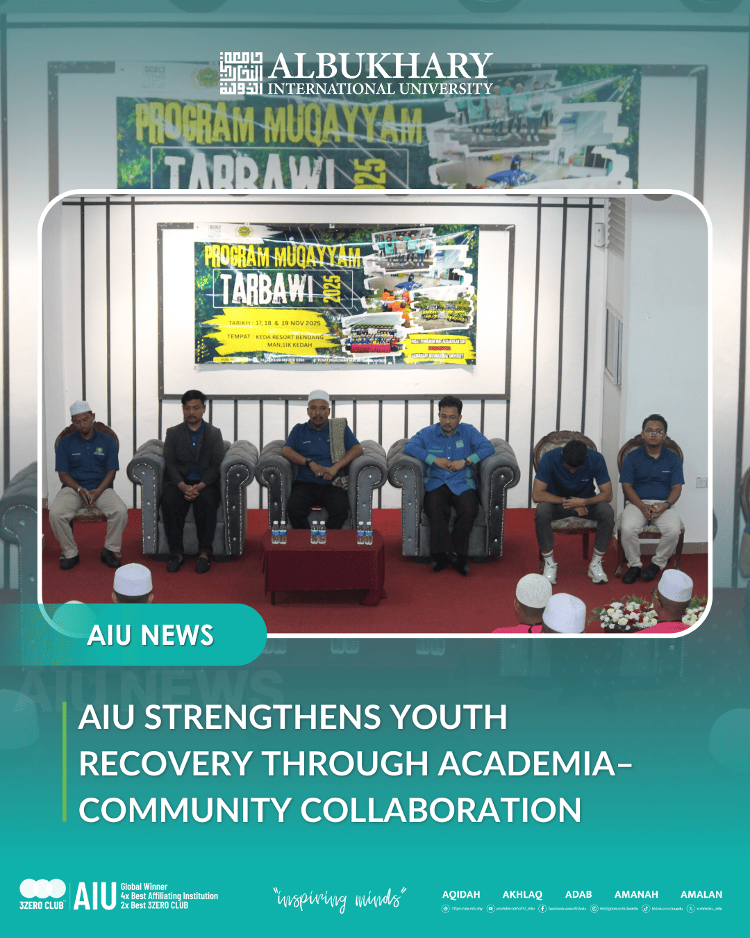 ALOR SETAR, 16 December 2025 – Albukhary International University (AIU), in collaboration with Pusat Pemulihan Nur Al-Barakah Sufi (PPNABS), successfully co-organised Mukhayyam Tarbawi 2025 from 17 to 19 November 2025 at KEDA Resort Bendang Man, Sik, Kedah, to support youth …